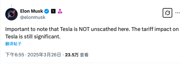 “重要的是要注意,特斯拉在这里并非毫发无损,”马斯克写道,“关税对特斯拉的影响仍然很大。”