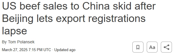 FX168财经报社(亚太)讯 美国政府周四(3月27日)的数据显示,在中国允许数百家美国肉类加工厂出口的注册到期后,美国对华牛肉销量大幅下降。针锋相对的关税争端还导致美国对华肉类和其他商品的关税上升,使这些产品对中国买家的吸引力下降。