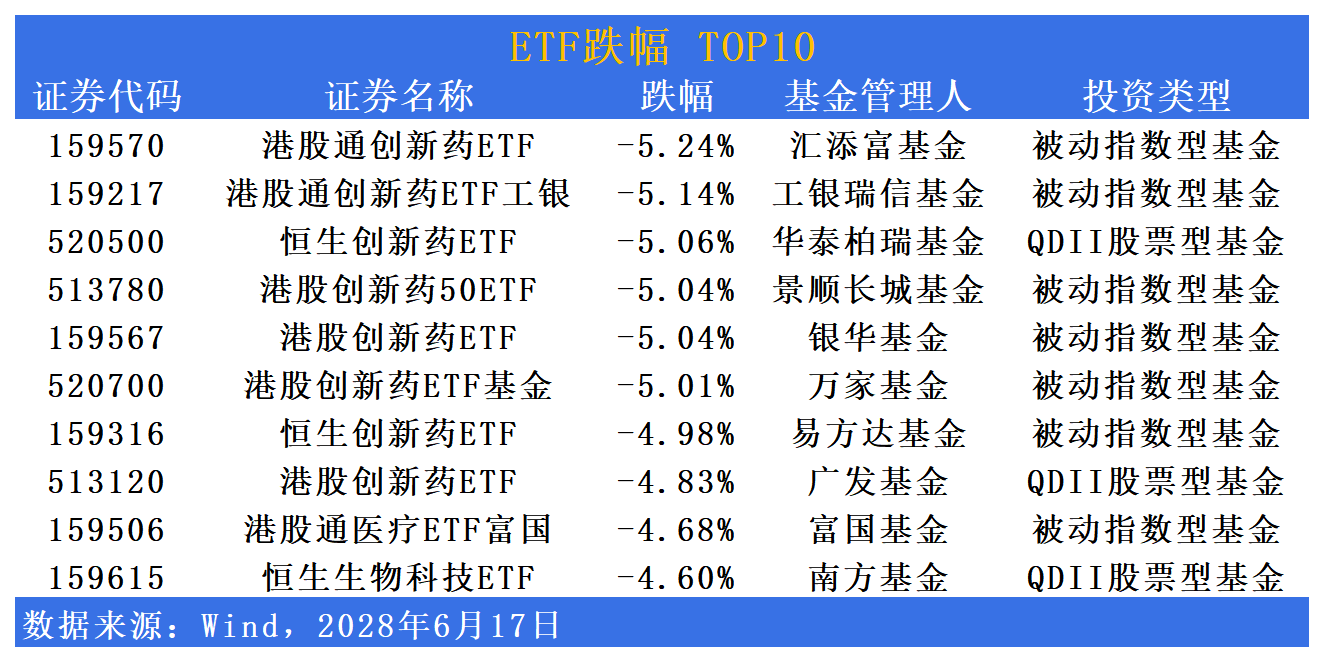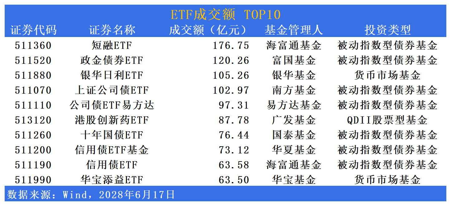 成交额方面,短融ETF(511360)、政金债券ETF(511520)、银华日利ETF(511880)、上证公司债ETF(511070)成交额超百亿元。港股创新药ETF(513120)成交额居股票类ETF第一。