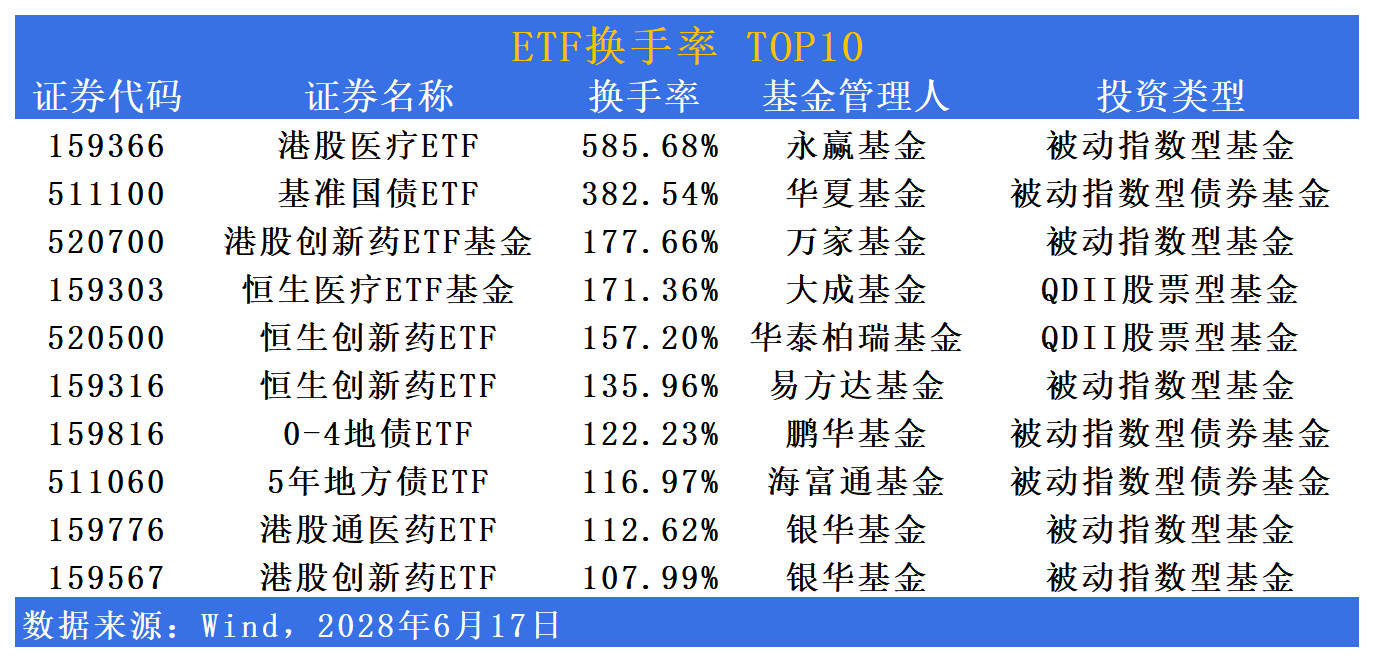 换手率方面,多只股票型ETF换手率超100%。港股医疗ETF(159366)换手率达585.68%,港股创新药ETF基金(520700)、恒生医疗ETF基金(159303)、恒生创新药ETF(159316)等换手率居前。