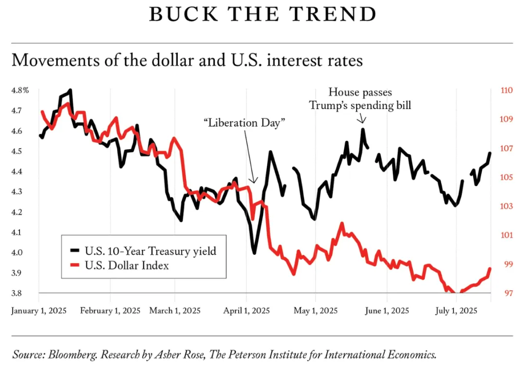 直到今年 4 月,美元还紧密跟随美国十年期国债利率的日常波动。