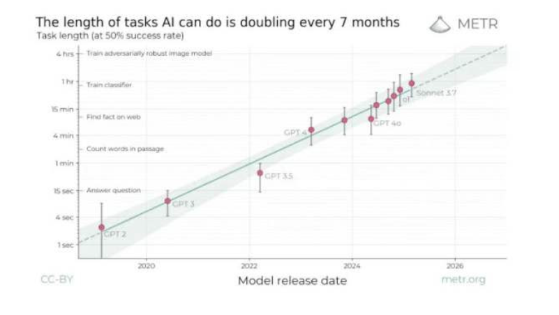 施里特维泽列举了多项研究成果,展示AI近期的能力突破,并提到一家研究AI的非营利机构METR发布的图表。