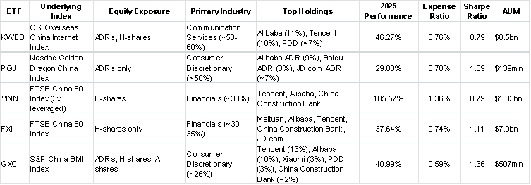 YINN以105%的年内回报率领先所有同类产品,但这主要源于杠杆效应。若考量风险调整后回报,GXC因覆盖ADR、H股及A股形成更广泛的风险分散,从而在波动性控制方面占据优势。