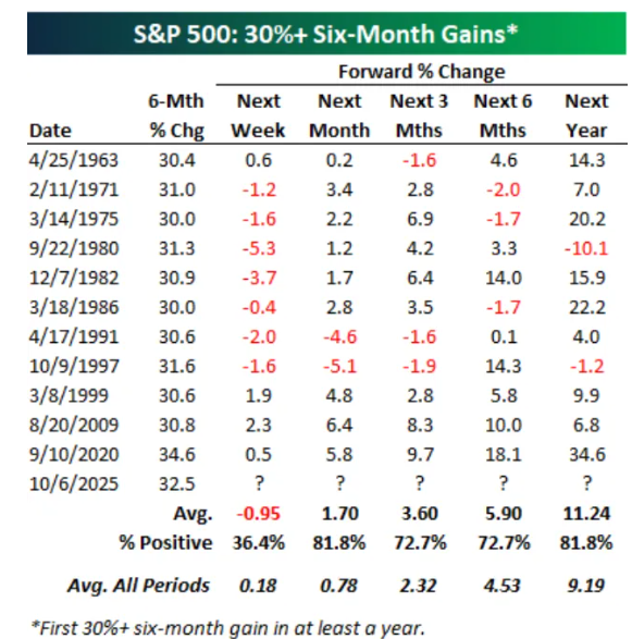 Bespoke投资集团的策略师指出,美国投资者本周将迎来两个值得关注的里程碑——周三是标普500创下今年低点以来的六个月整,周日则是当前牛市的三周年纪念。这个机构表示,标普500的六个月滚动涨幅首次突破30%,这是自2020年10月2日以来首次出现。根据自1953年以来的历史数据,在过去至少一年中首次出现这种情况的12个交易日中,标普500短期内往往出现轻微回调,但三个月至一年后的回报通常优于平均水平。