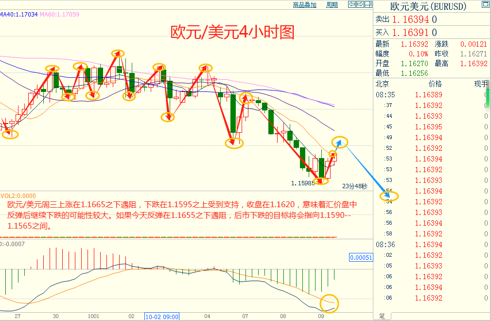 欧美周三下跌在1.1595之上受到支持,上涨在1.1665之下遇阻,意味着欧美短线上涨后有可能保持下跌的走势。如果欧美今天上涨在1.1655之下遇阻,后市下跌的目标将会指向1.1590--1.1565之间。今天欧美短线阻力在1.1650--1.1655,短线重要阻力在1.1685--1.1690。今天欧美短线支持在1.1590--1.1595,短线重要支持在1.1565--1.1570。