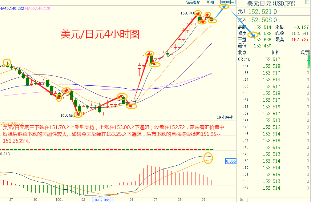 美元/日元:可以在153.25---151.95的区间上限卖出,有效破位40个点止损,目标在区间的下限。