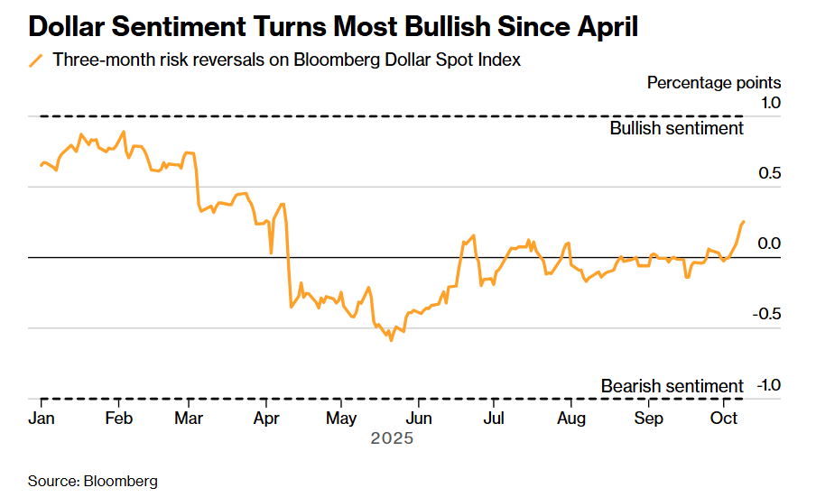 尽管美国政府关门持续,但世界主要储备货币美元仍接近两个月来的最高点。亚洲和欧洲的交易员表示,避险基金正在增加看涨期权押注,预计美元将继续在年底前反弹。