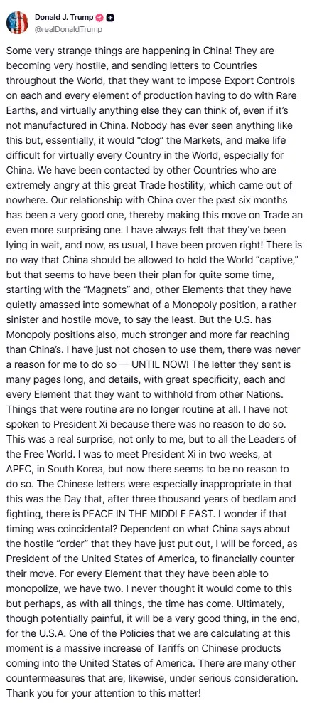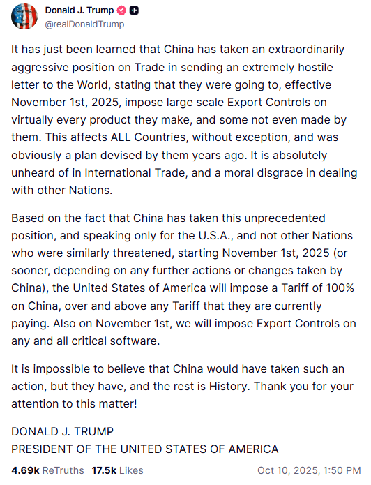 “从2025年11月1日开始(或更早,视中国是否采取进一步行动或政策调整而定),美国将对中国征收额外100%的关税,这将在现有关税基础上叠加执行。”