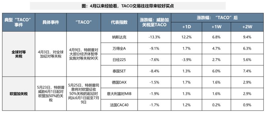 "TACO交易"概念在券商研判中频繁出现。这一策略基于关税威胁往往难以完全落地的历史规律。威胁发出后市场短期下跌,随后政策缓和带来反弹机会。