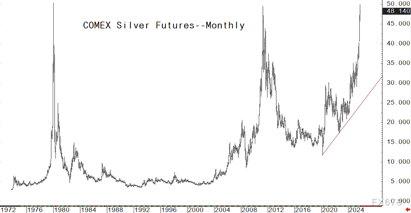查看纽约商品交易所(Comex)近期白银期货的月线连续图可知,1980年1月白银价格触及历史高点,近期期货基准价为每盎司50.36 美元。此后逾30年,白银价格才在2011年对1980年的历史高点发起挑战——当时近期期货价格达到每盎司49.52美元。而在2011年之后,又过了14年,白银价格才在本周突破2011年高点,但仅高出44美分,近期白银期货本周最高触及每盎司49.965美元。