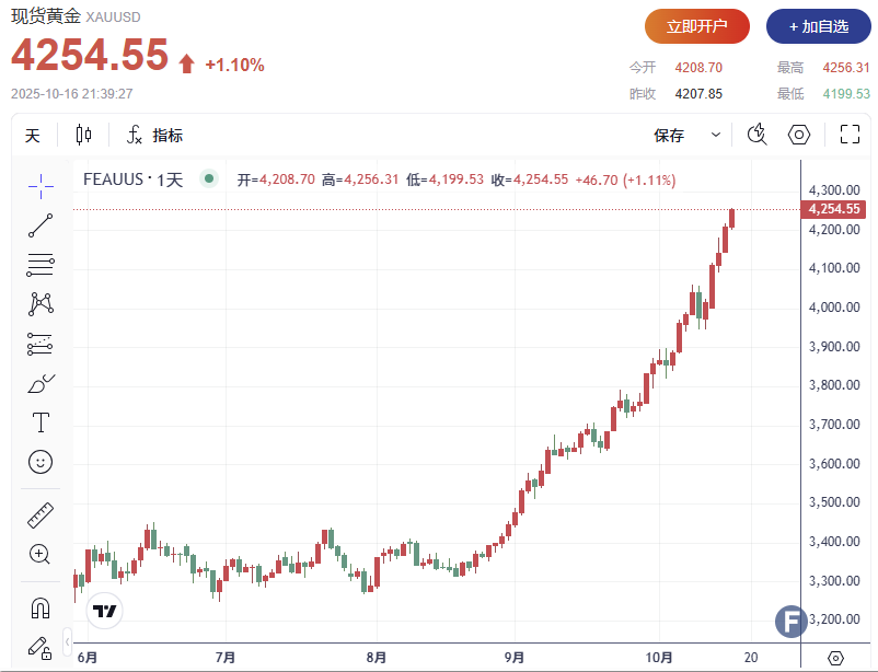 现货黄金周内累计上涨超过5%,盘中一度突破每盎司4256.31美元,创下历史新高,延续自8月以来的迅猛涨势。截至发稿,现报每盎司4254.55美元。
