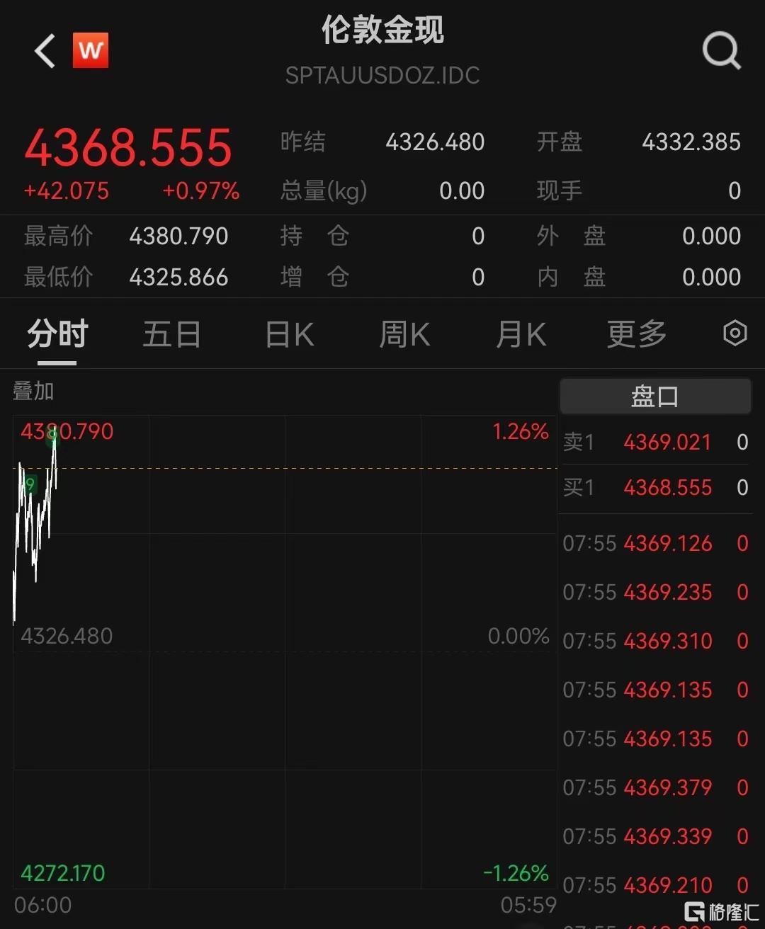 现货黄金盘初疯涨,一度触及4380美元/盎司的历史新高,现回落至4365美元/盎司。