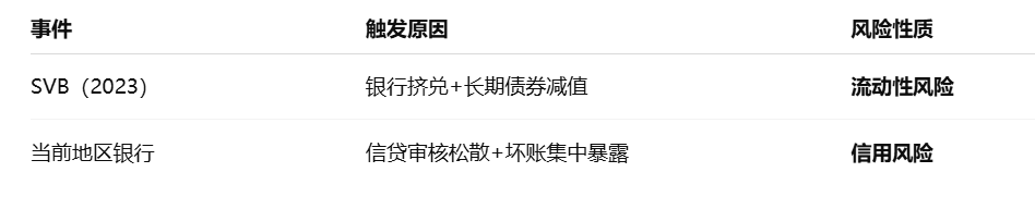 SVB 的问题在于资产负债错配和加息周期引发的流动性恐慌;而当前地区银行的问题,则更多源自贷款标准松懈、对风险的误判和信用质量的恶化。
