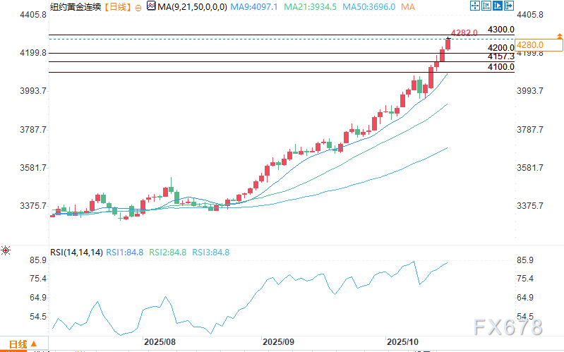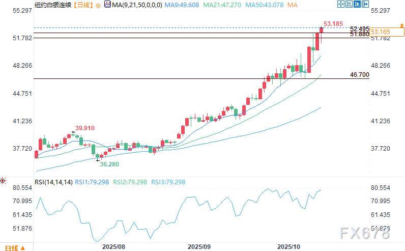 美元)盘中价格创下每盎司4263.40美元的历史新高,12月交割的白银期货盘中价格则达到每盎司52.89美元的历史高点。持续的避险需求与技术性买盘推动价格不断攀升,黄金和白银市场的空头投资者则选择观望,不愿螳臂当车。