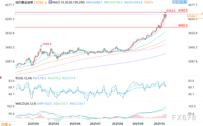 从技术面来看,12月黄金期货多头在短期整体技术面占据优势。但周五市场出现看空的“关键反转下跌”形态,这一图表信号暗示市场可能已形成顶部。多头的下一个上行价格目标是推动合约收盘价突破4392.00美元的合约高点/历史高点这一强劲阻力位;空头的下一个短期下行价格目标是推动期货价格跌破4000.00美元这一强劲技术支撑位。第一阻力位见于4300.00美元,进一步阻力位在4350.00美元;第一支撑位见于隔夜低点4229.70美元,进一步支撑位在4200.00美元。