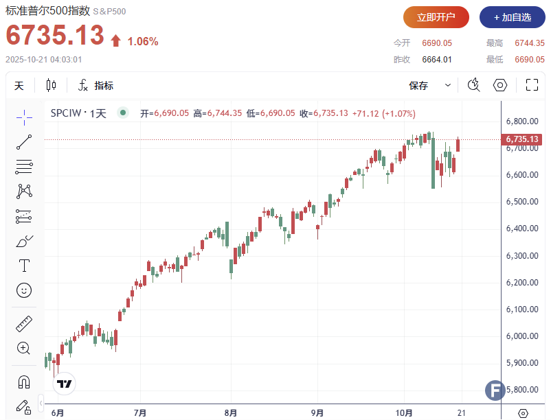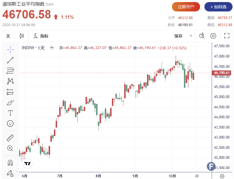 FX168财经报社(北美)讯 周一(10月20日),美股全面走高,受苹果公司(Apple, AAPL)强劲上涨带动,同时投资者押注美国政府停摆即将结束,并关注本周即将公布的一系列重量级企业财报与通胀数据。