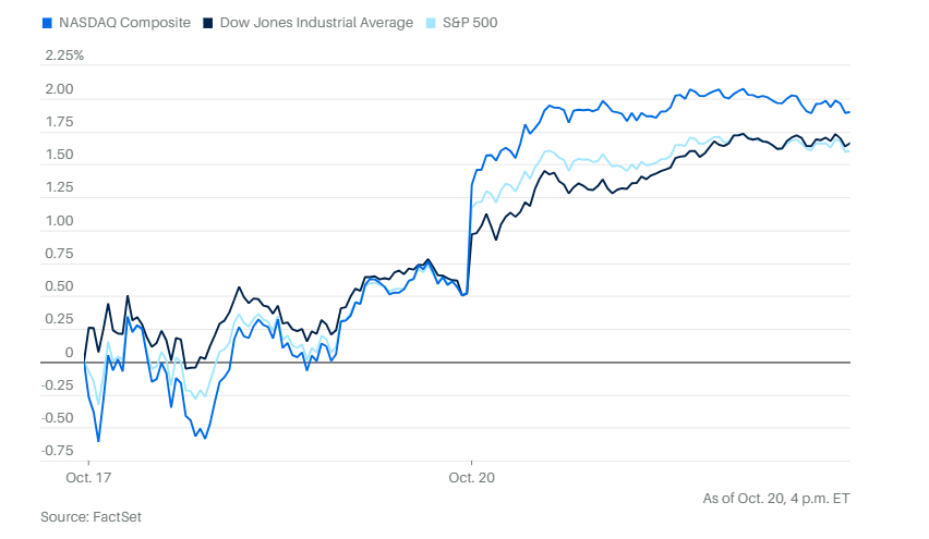 周一美股再次上涨。道琼斯工业平均指数上涨516点,涨幅1.1%。标普500指数上涨1.1%。纳斯达克综合指数上涨1.4%。三大指数都接近历史最高收盘点位。中小盘的罗素2000上涨1.94%。