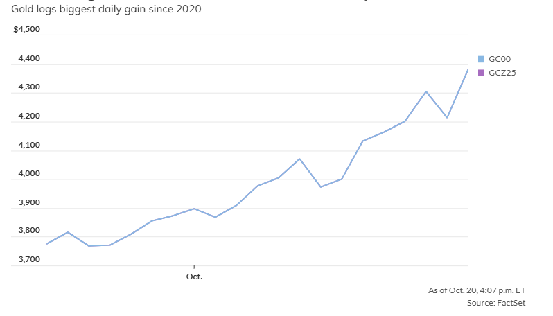 周一,黄金价格大幅飙升,连续合约创下每盎司4,385.40美元的新纪录,避险买盘强劲涌入,抄底近期回调。现货黄金上涨3%至每盎司4,377.50美元。12月交割的黄金上涨146.10美元,涨幅4.09%,为2020年4月9日以来的最大单日百分比涨幅。