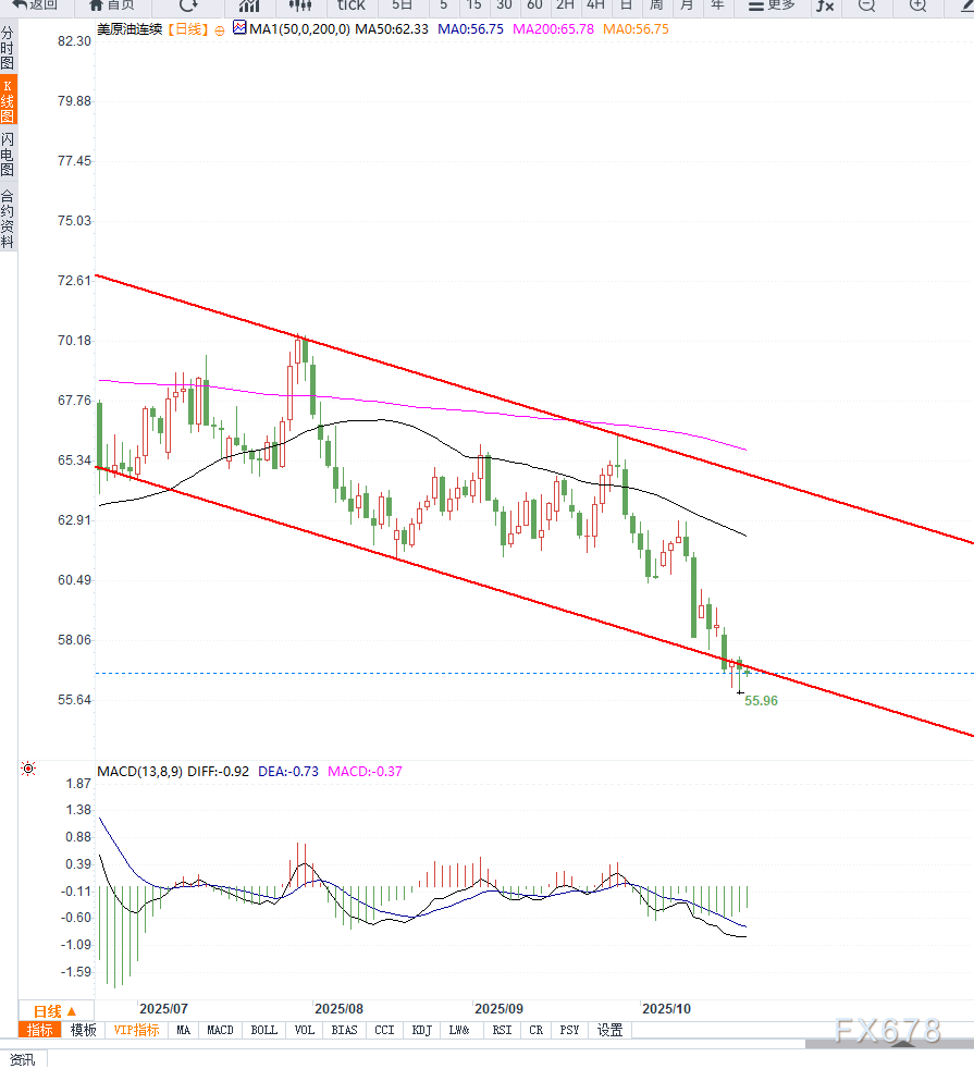 从技术面来看,WTI价格目前仍在下行通道之内。若后续无法站稳60 美元关口,短期趋势可能继续延伸至55–56 美元区域。该价位同时是心理支撑与前期低点所在,一旦跌破,恐引发更多被动卖盘。