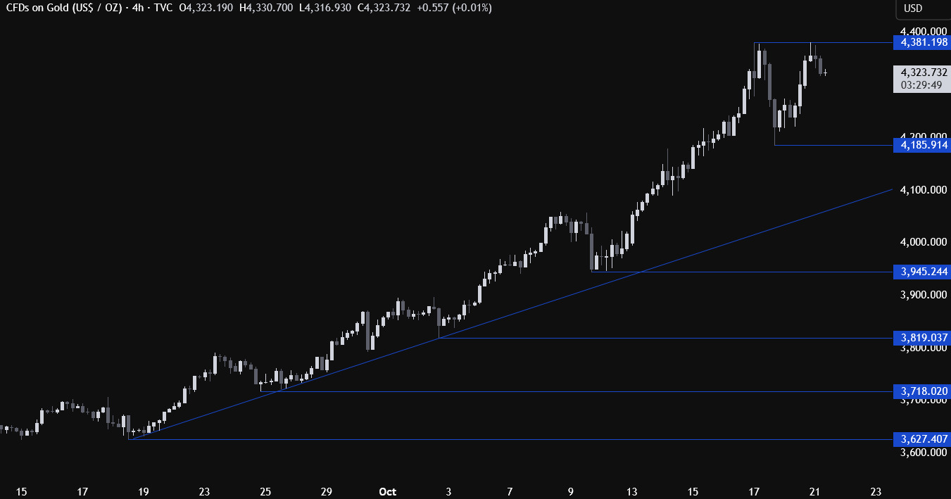 在4小时图上,昨日金价未能站稳于上周五高点上方,可能形成短期“双顶”结构,预示潜在回调风险。预计空头可能在高位布局,等待价格跌破关键趋势线或4,185美元支撑位以确认更深调整。多头则希望金价能突破高位,打破双顶形态并再度刷新纪录。