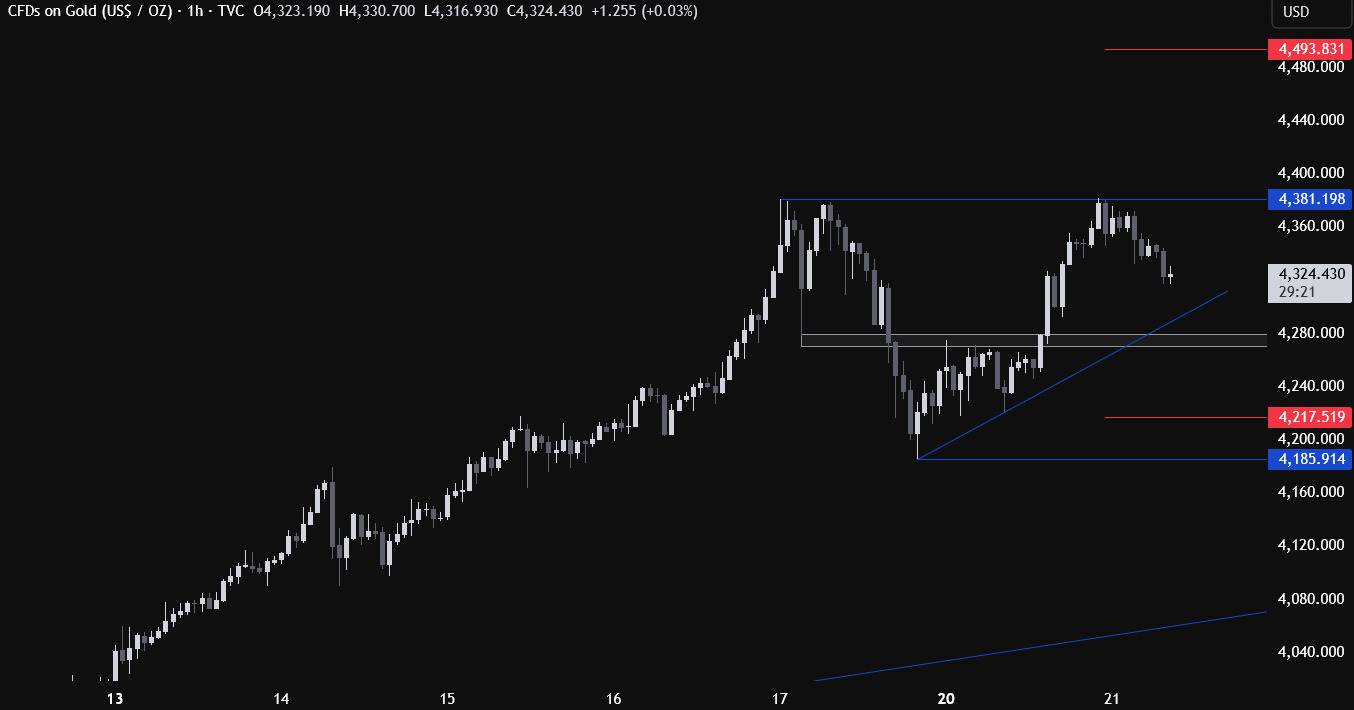 在1小时图上,金价在4,280美元附近形成短期支撑区,同时伴随一条小幅上升趋势线。若金价在该区域企稳,多头可能选择低吸入场,以较小风险博取再创新高的机会。相反,若价格跌破该支撑,空头或加大押注,目标指向主要趋势线。图中的红线标示了当日的平均波动区间。