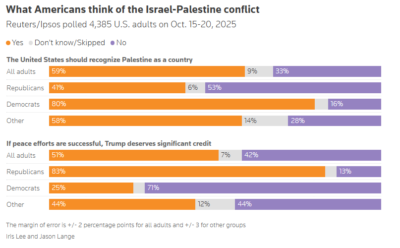 路透社/益普索一项民调显示,大多数美国人认为美国应承认巴勒斯坦国地位,包括80%的民主党人和41%的共和党人。这表明特朗普反对承认巴勒斯坦建国的立场与公众意见不符。