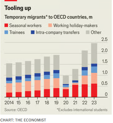 在经济合作与发展组织(OECD)国家中,2023年约有250万名实习生、季节工和其他临时工人流入,相较2014年的150万人大幅增长。法国、日本和西班牙的增幅尤其明显。曾被视为海湾富国或新加坡所特有的移民模式,正在全球推广。