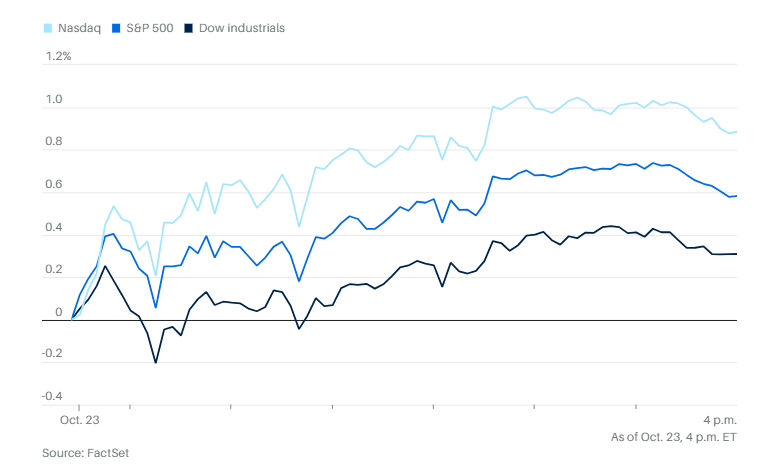 在美国政府关门以来首批官方数据即将公布之前,投资者加大力度买入风险资产,尤其是白宫宣布特朗普将于下周在亚洲会见习近平后,股市加快上涨。道琼斯工业平均指数上涨144点,涨幅0.3%。标普500指数上涨0.6%。纳斯达克综合指数上涨0.9%。主要股指一度逼近历史最高收盘点位,但在交易最后一小时略有回落。