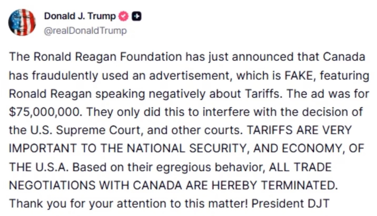 特朗普在社交平台上发文称:“关税对美国的国家安全与经济极其重要。”(“TARIFFS ARE VERY IMPORTANT TO THE NATIONAL SECURITY, AND ECONOMY, OF THE U.S.A.”)“基于他们极其恶劣的行为,与加拿大的所有贸易谈判即刻终止!”(“ALL TRADE NEGOTIATIONS WITH CANADA ARE HEREBY TERMINATED.”)