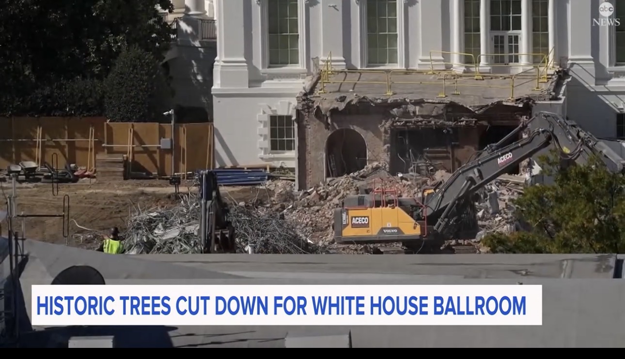 据ABC新闻报道,卫星图像显示,特朗普政府斥资3亿美元修建豪华宴会厅的工程,已在白宫场地上砍掉至少六棵树,其中包括为沃伦·哈定和富兰克林·罗斯福树立纪念的两棵历史性的白玉兰树。