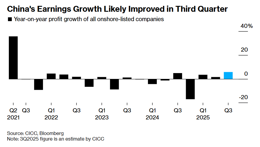 (中国企业第三季度盈利增速预计加快 来源:中金公司、彭博社)
