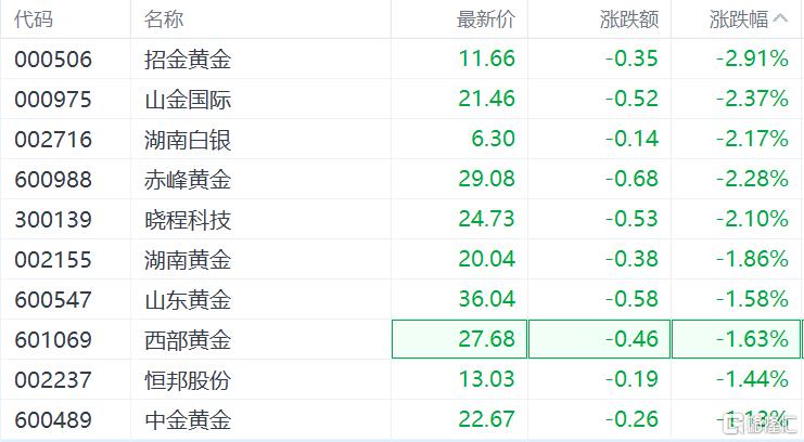 A股市场中,招金黄金、山金国际、赤峰黄金、晓程科技跌超2%,湖南黄金、山东黄金、西部黄金、中金黄金纷纷走低。