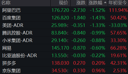 中概股走势分化,纳斯达克中国金龙指数收跌1.23%。小马智行涨11.13%,哔哩哔哩升5.37%,京东、小鹏汽车均录得上涨;但腾讯音乐跌2.95%,阿里巴巴跌1.52%,百度跌1.43%。汽车股中蔚来涨0.99%,理想汽车跌1.07%。