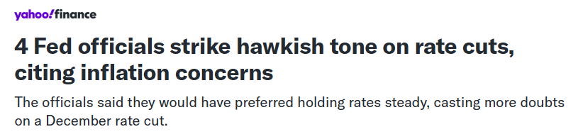 这一系列表态为美联储主席鲍威尔本周的警告增添分量——鲍威尔在记者会上强调,“12月是否再降息,并非既定事实,远非如此(far from it)。”