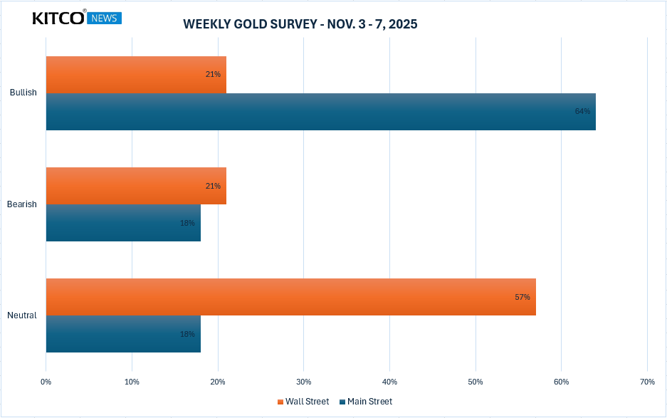 市场情绪:机构普遍观望 散户略显乐观根据Kitco News黄金调查,市场分歧明显。21%的分析师预计下周金价将上涨,21%预计下跌,57%认为金价将维持震荡整理。
