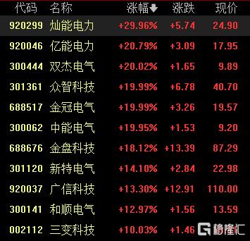 电网设备股大面积涨停,灿能电力30CM涨停,亿能电力涨超20%,双杰电气、众智科技、金冠电气、中能电气20CM涨停,金盘科技涨超18%,新特电气涨超14%。