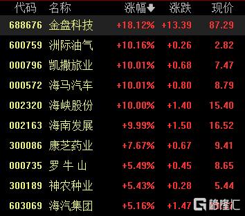 海南、免税店板块强势,金盘科技涨超18%,洲际油气、凯撒旅业、海马汽车、海峡股份、海南发展涨停,康芝药业涨超7%。