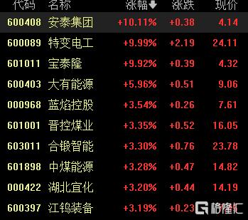 煤炭股走高,安泰集团、特变电工、宝泰隆涨停,大有能源涨超5%,蓝焰控股、晋控煤业、中煤能源等跟涨。