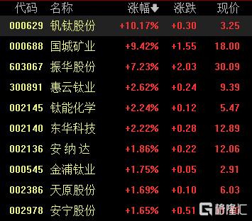 钛白粉概念大涨,钒钛股份涨停,国城矿业涨超9%,振华股份涨超7%,惠云钛业、钛能化学、东华科技等跟涨。