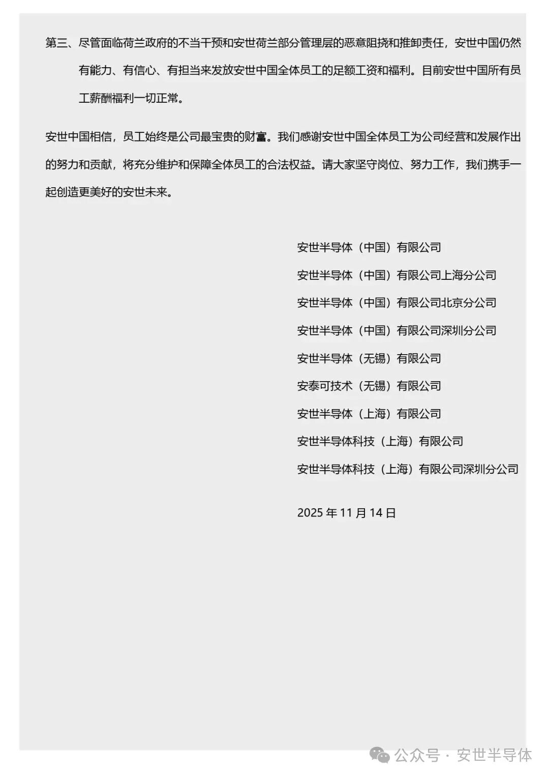 11月14日,安世中国发布致全体员工信表示,尽管面临荷兰政府的不当干预和安世荷兰部分管理层的恶意阻挠和推卸责任,安世中国仍然有能力、有信心、有担当来发放安世中国全体员工的足额工资和福利。目前安世中国所有员工薪酬福利一切正常。