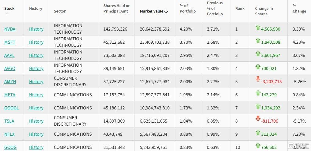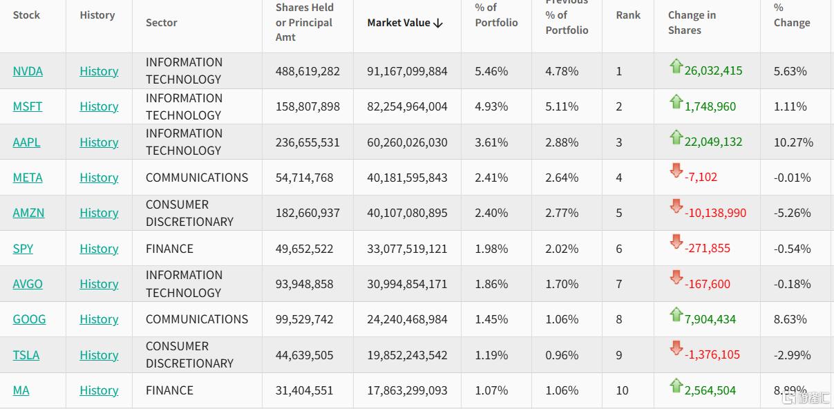 在前十大重仓股中,英伟达位居第一,持仓约1.43亿股,持仓市值约为266.42亿美元,占投资组合比例为4.20%。