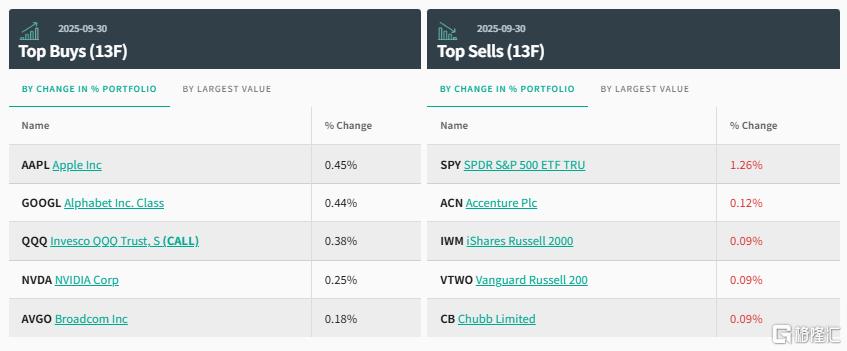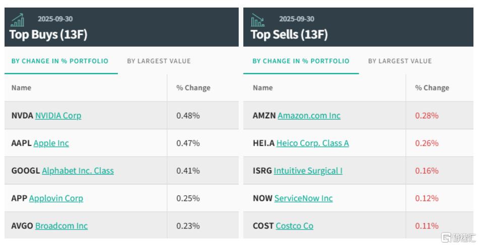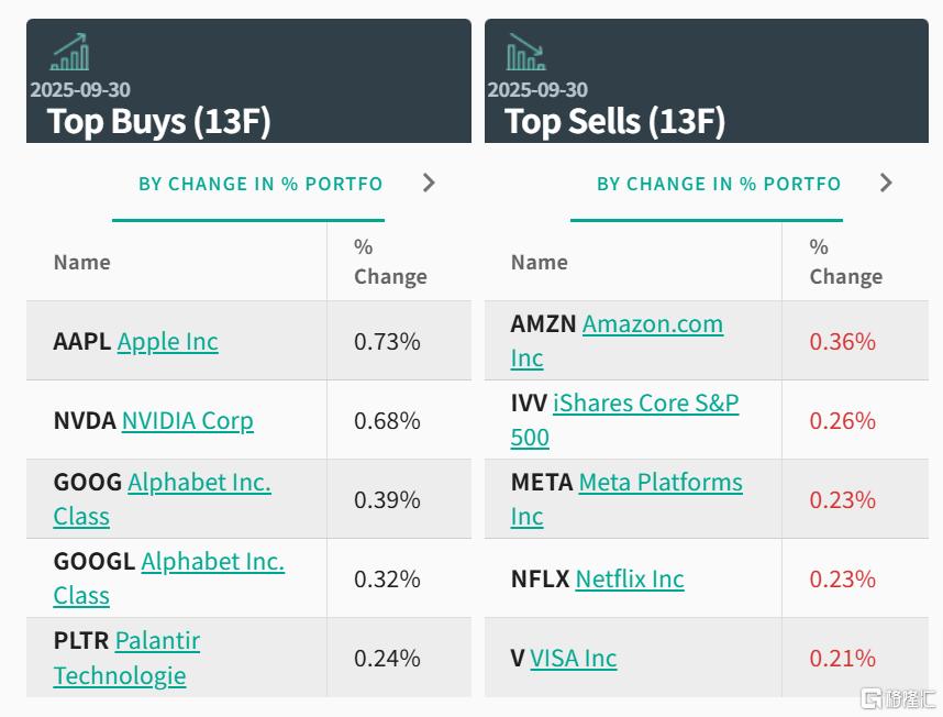 前五大买入标的分别为:苹果、英伟达、Alphabet公司C类股 、Alphabet公司A类股和Palantir科技公司。
