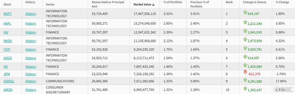 苹果排名第三,持仓2.37亿股,持仓市值602.6亿美元,占投资组合比例为3.61%。