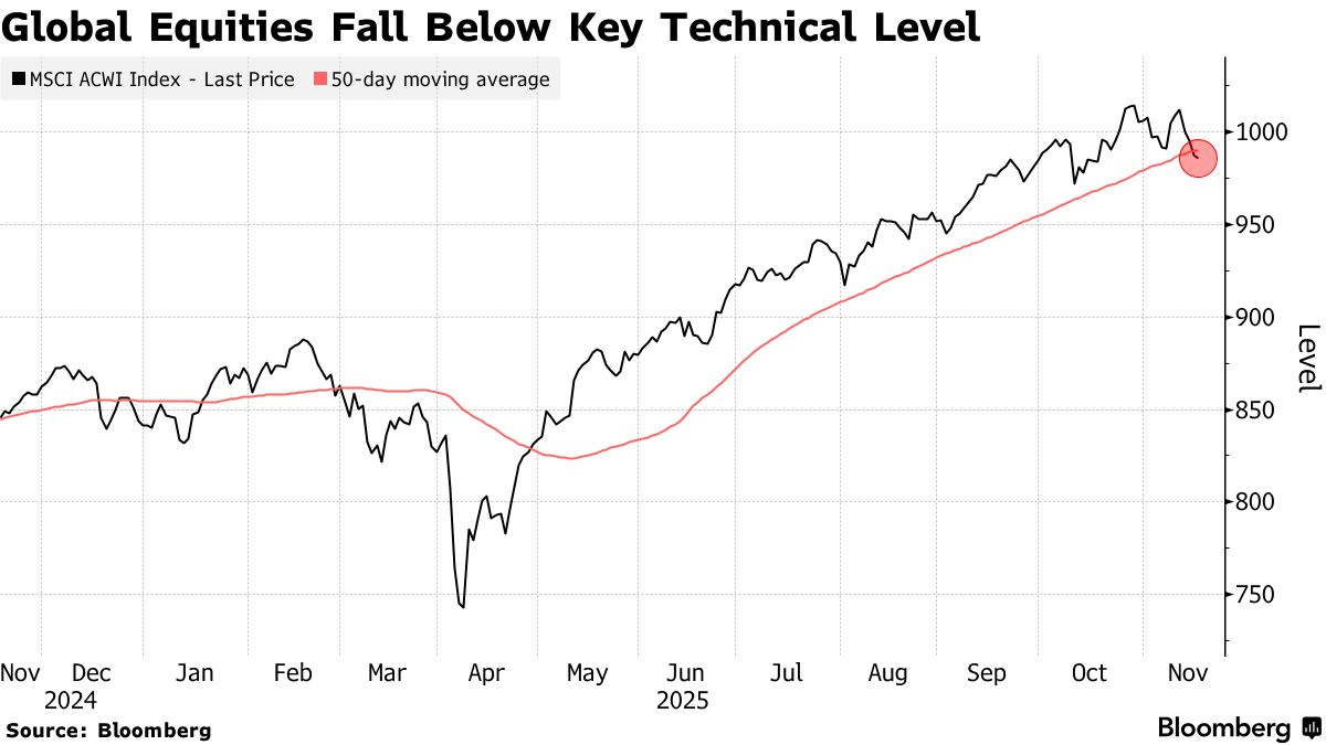 全球股票指数徘徊在一个月低点附近,亚洲股市下跌 2%,有望连跌第三日。MSCI 亚太指数中下跌股票数量几乎是上涨股票的四倍,该指数自 4 月以来首次跌破 50 日均线,被部分投资者视为看跌信号。