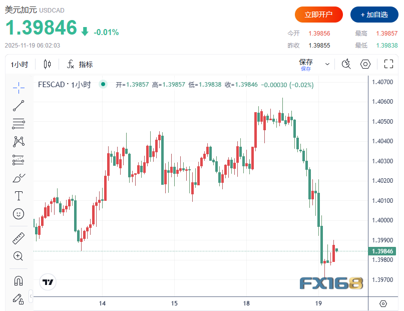 周二美市尾盘,美元/加元下跌0.43%,收报1.39855,约合71.53美分。该汇率在交易时段内触及1.3970,为10月30日以来的最高水平,同时也是8月22日以来最大单日涨幅。这一走势反映出投资者在整体市场环境逐渐稳定后对加元的重新青睐。