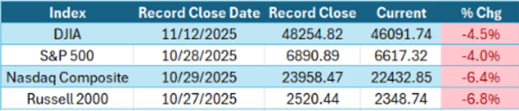 美国股市周二下午继续下跌,标普500指数和道琼斯工业平均指数均录得连续第四个交易日下跌。这轮抛售已将多个主要指数推向修正区间的一半位置,引发市场担忧:这波下跌是否会在年底前演变成更大规模的回调。