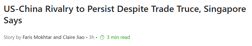 “我确信,激烈的竞争和对抗将继续下去,”黄循财周三在新加坡举行的创新经济论坛上接受彭博新闻社主编约翰·米克尔思韦特(John Micklethwait)采访时说。“虽然这可能是暂时的休战,是关系的暂时稳定,但这确实是目前急需的。”