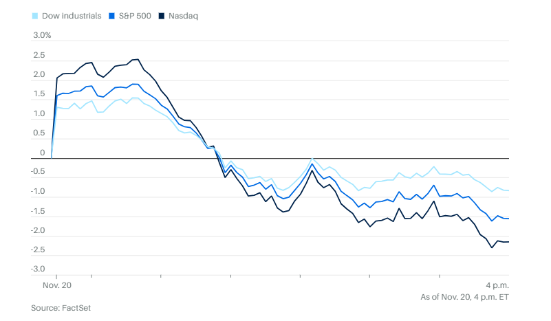 美股周四早盘受英伟达强劲财报提振一度走高,但随后涨幅尽失,收盘转跌。纳斯达克综合指数下跌2.2%。标普500指数下跌1.6%。道琼斯工业平均指数下跌386点,跌幅0.8%。