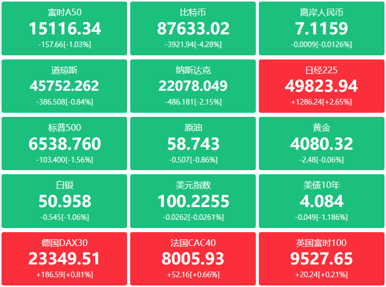 外盘:市场评估英伟达财报及延9月非农数据,同时对美联储12月再次降息预期减弱,美股集体收跌,其中道指跌386.51点,跌幅0.84%报45752.26点;纳指跌486.18点,跌幅2.15%报22078.05点;标普500跌103.40点,跌幅1.56%报6538.76点;大型科技股集体下挫,AMD跌超7%,甲骨文跌超6%,奈飞、英伟达跌超3%,特斯拉、亚马逊跌超2%;中概股多数下跌,蔚来跌超6%,小鹏汽车跌超5%,哔哩哔哩、百度、拼多多跌超4%,阿里巴巴跌超3%,理想汽车、爱奇艺跌超2%。