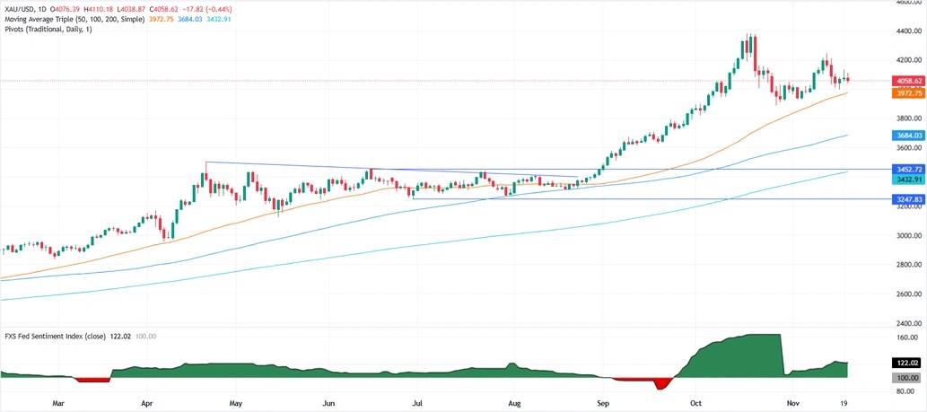 FXStreet分析师Christian Borjon Valencia指出,尽管美联储官员态度转向鹰派,但黄金的上涨趋势依然保持完好。然而,价格走势表明,一旦金价跌破11月18日低点3998美元/盎司,卖方可能占据主导地位,并可能进一步测试50日简单移动平均线(SMA)3954美元/盎司。